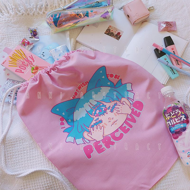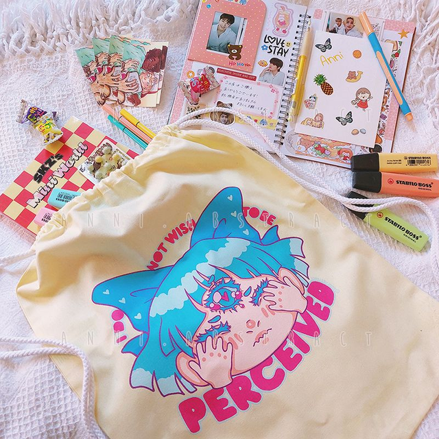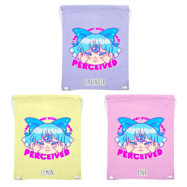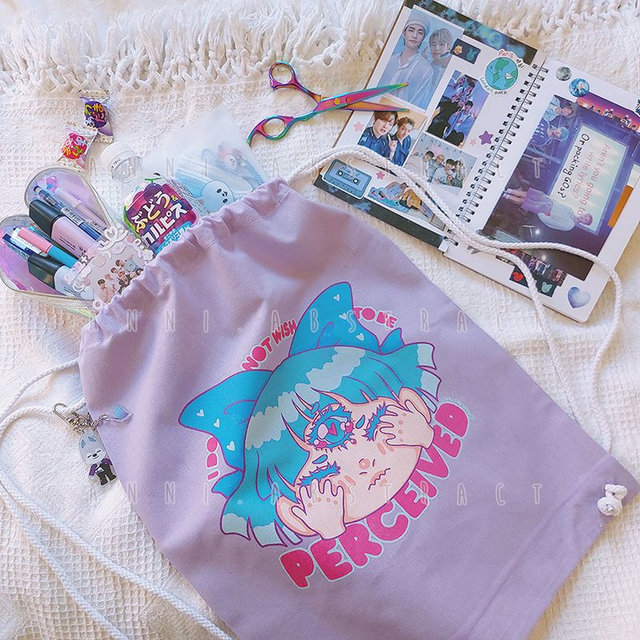 A cute drawstring bag for when you wanna let everyone know you'd rather not be perceived right now. Available in 3 colours, about 46x37 cm in size. Comes with a random matching surprise gift. ♡