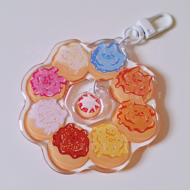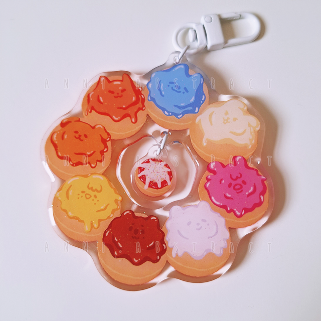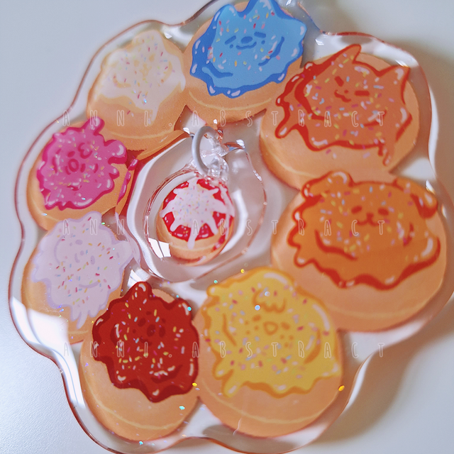 Doublesided clear glitter epoxy keyring with two charms, about 8x8 cm (big chonk :]) in size. Special feature: a second charm in the middle, attached to the donut!