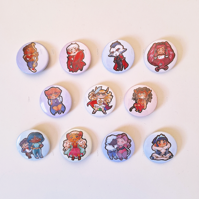 Ø 37 mm glossy button badges, cut and pressed by hand.